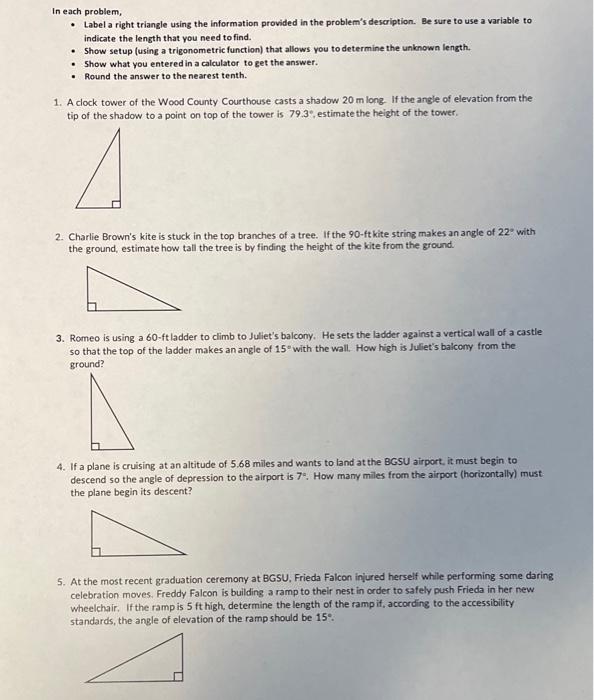 How to Solve a Right Triangle in a Word Problem - Study.com Step 2: Label the sides and/or angles of the right triangle that were given in the word problem, and identify what piece of missing information we hope to find. Step 3: Solve for the missing piece ...