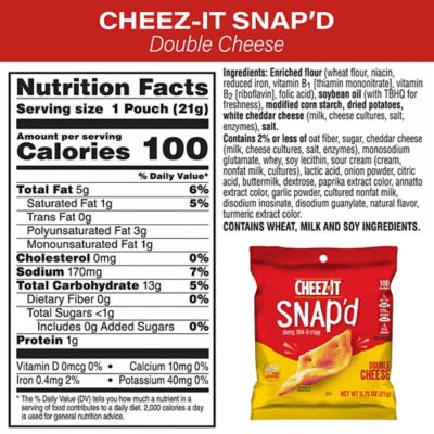 Cheez-It® Snap'd® Double Cheese Crackers | Cheez-It® contains 2% or less of salt, oat fiber, sugar, cheddar cheese (milk, cheese cultures, salt, enzymes), monosodium glutamate, whey, onion powder, sour cream (cream, nonfat milk, cultures), lactic acid, citric acid, buttermilk, dextrose, paprika extract color, annatto extract color, soy lecithin, garlic powder, cultured nonfat milk, disodium …