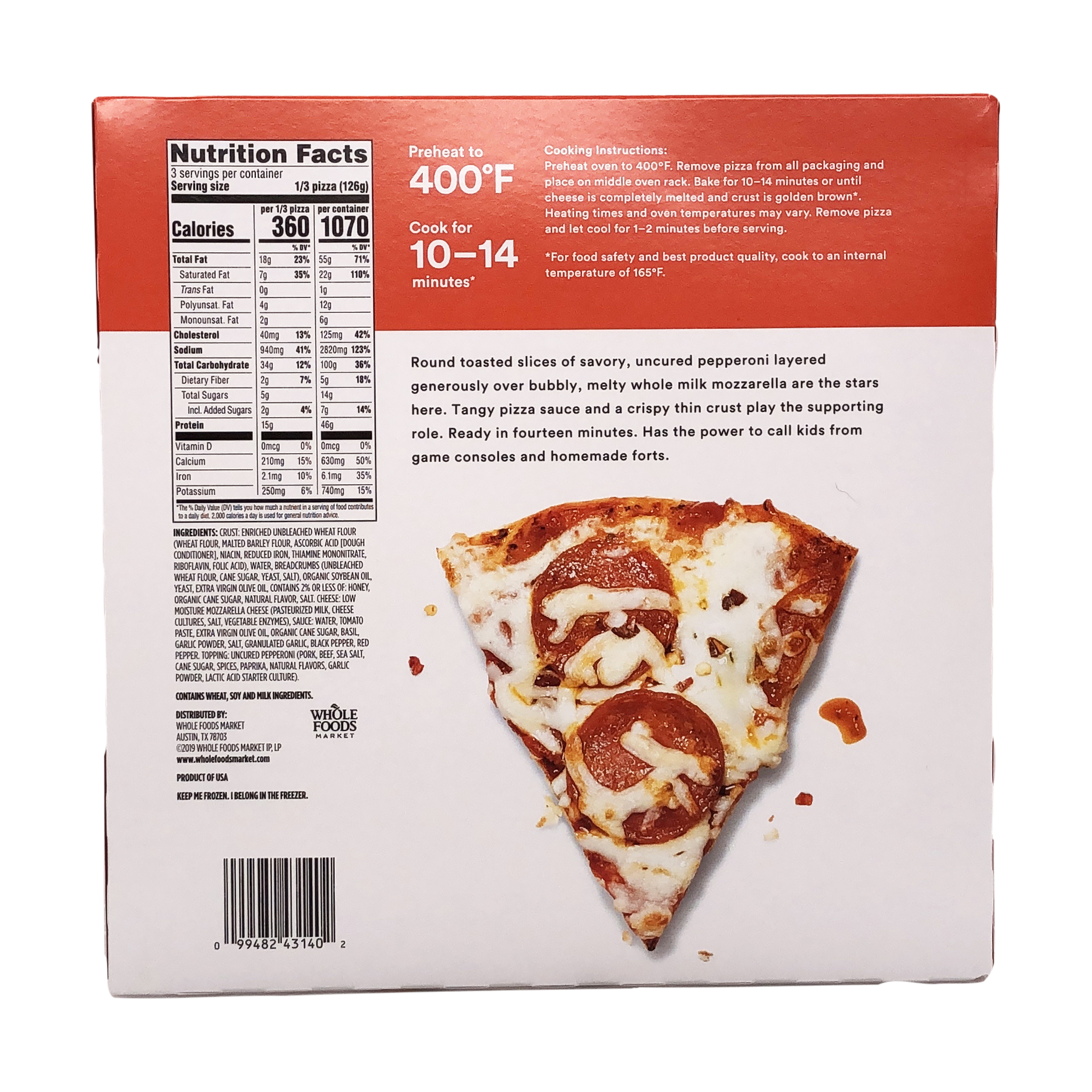 Quest Quest® Thin Crust Pizza - Uncured Pepperoni 1. Preheat oven to 400 degrees F. Keep pizza frozen during preheat. 2. Remove pizza from the box, discard the freshness wrap and cardboard tray. 3. Place frozen pizza on a baking sheet and bake for 20-23 minutes, or until cheese is completely melted and starting to brown. 4. Take pizza out of the oven.