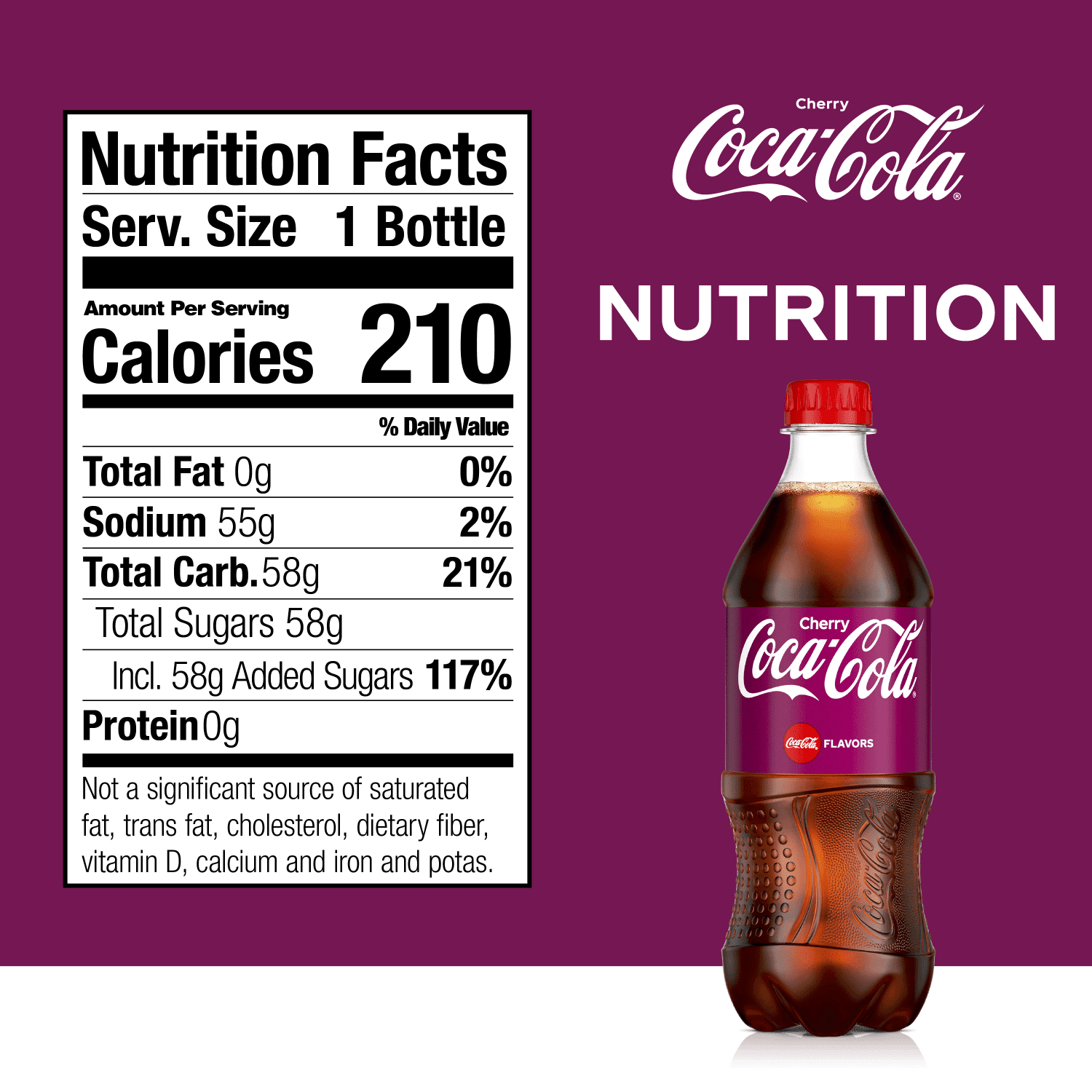 Calories in Coca-Cola Cherry Coke (20 oz) and Nutrition Facts - FatSecret There are 260 calories in 1 bottle (591 ml) of Coca-Cola Cherry Coke (20 oz). Calorie breakdown: 0% fat, 100% carbs, 0% protein. Related Sodas from Coca-Cola: Feisty Cherry Diet Coke Mellow Yellow Glass Bottle Starlight Orange Vanilla Zero Sugar (Bottle) Limca find more coca-cola sodas products More Products from Coca-Cola: Mini Energy (Can) Energy