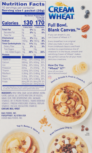 Cream of wheat Nutrition Facts - Eat This Much Cream of wheat Nutrition Facts - Eat This Much Cream of wheat Cereals, instant, prepared with water, without salt Find on Amazon Percent calories from... Quick stats 149.4 Calories 31.5g Carbs (30.1g net carbs) 0.6g Fat 4.4g Protein Estimated $0.15 I want to eat calories I like to eat Try these: Cream of wheat Cereals, instant, dry Cream of wheat Wheat Farina :: Bob's Red Mill Natural Foods Description. Bob's Red Mill Creamy Wheat Hot Cereal, also known as Wheat Farina, has been a "plead for more" favorite around the mill for many years. It's a finely granulated cereal made from hard wheat. The farina is produced by gently cracking the grain and then air purifying to remove most of the lighter-weight bran particles from the ... Cream of Wheat to Drop Black Chef From Packaging, Company Says Sept. 27, 2020. The Black chef will no longer appear on Cream of Wheat packaging where he was the face of the brand for more than a century, the product's parent company announced in a decision ... Cream of Wheat may change after Mrs. Butterworth's, Aunt Jemima news Cream of Wheat's parent company, B&G Foods, said it is "initiating an immediate review" of the brand's packaging. The announcement follows decisions by the parent companies of Aunt Jemima,...