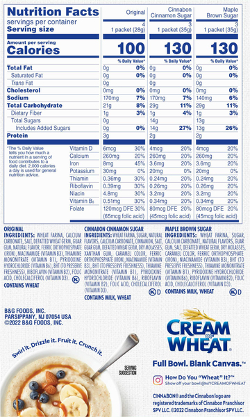 Instant Cream of Wheat, Cream of Rice, Cream of Wheat Flavors Our Favorites. Cocoa Nut with Real Almonds. Maple Brown Sugar. Original 2½ Minute. Original.