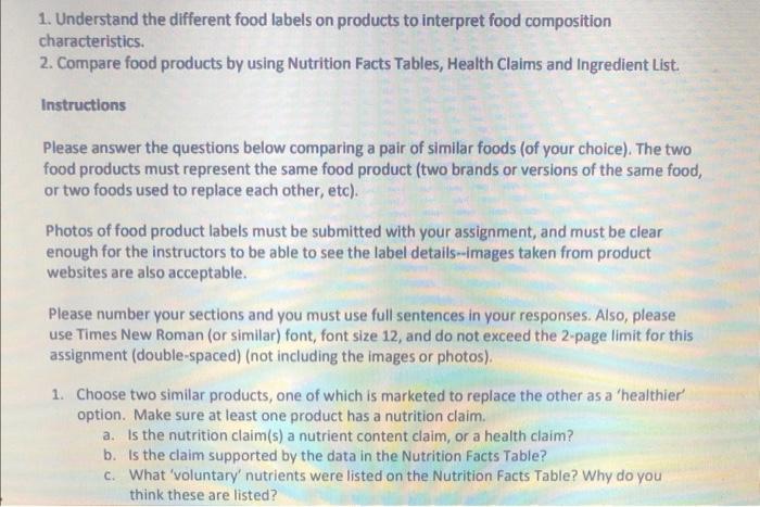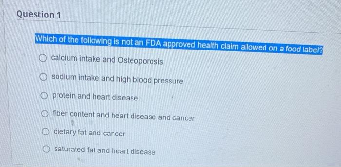 How to Submit Label Claim Petitions & Notifications | FDA In accordance with FDA regulations (e.g., 21 CFR 101.70), hard copy originals of petitions and notifications for food and dietary supplement claims are required to be submitted to the appropriate ... What is a nutritional claim food? Which health claim on a food label is not allowed? Health claims for treating, preventing, or curing diseases, such as Alzheimers and cancer are not allowed on food products. These are considered to be drug claims. Are nutrient content claims exact? What is a Nutrient Claim? This is a claim concerning a products nutritional value. Nutrient Claims on Food Labels | Home & Garden Information Center At least 25% less sugar*. Fiber Claims. (If food is not low in total fat, the label must state total fat in conjunction with the fiber claims.) High fiber. 5 grams or more. Good source of fiber. 2.5 grams to 4.9 grams. More or added fiber. At least 2.5 grams more*. Chapter Two Flashcards | Quizlet Which health claim on a food label is NOT allowed? Diets rich in Vitamin C will reduce the incidence of colds and flu. Recommended Dietary Allowances were first published in which decade? 1940's Which of the following is NOT an authorized health claim associating intake with a health consequence? Vitamin A intake and risk of cataracts.
